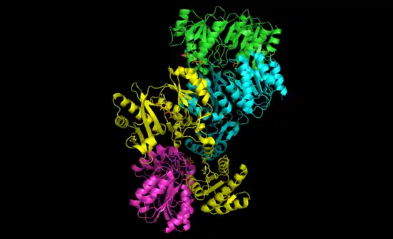 La structure tétramérique bactérienne a été cristallisée et caractérisée de manière très détaillée[5],[6]. Comme le montre l'image ci-dessous, les deux sous-unités α se trouvent de chaque côté de la structure tandis que les deux sous-unités β interagissent dans les régions centrales de la protéine. Dans cette configuration, chaque sous-unité α interagit avec une sous-unité β tandis que chaque sous-unité β interagit avec l'autre sous-unité β et l'une des deux sous-unités α[5].