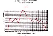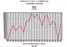 - 1969 : la cadence de l'usine est de 2 325 tonnes par jour. Il est travaillé 216 000 tonnes de betteraves et produit 28 800 tonnes de sucre, 22 000 hectolitres d'alcool et 80 tonnes de levure alimentaire. La fin des années 1960 voit le progrès de la régulation. Les régulateurs ARCA ont fait leurs preuves depuis de nombreuses années à l'évaporation, c'est maintenant à d'autres ateliers de voir apparaître d'autres types de régulation, souvent pneumatiques. Puis, aux turbines automatiques succède dans le domaine l'automaticité, la conduite de la cuite 1er jet et la mesure de conductibilité réglant l'introduction continue de sirop et maintenant une sursaturation donnée.