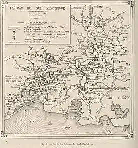 Sud-Électrique obtient aussi la concession de la distribution d’électricité d’une cinquantaine de communes du département de l'Hérault[2]. L'expérience de la société Sud-Électrique en matière d'électrification rurale et de fourniture d'électricité pour les usages agricoles (pompage, arrosage, moulins etc.) permet à son administrateur délégué, Henri Cahen, de publier en 1914 un article sur ces sujets, intitulé La Houille blanche et l'agriculture[13],[14]. Il y expose notamment que Sud-Électrique dispose d'un réseau à haute tension étendu sur les trois départements des Bouches-du-Rhône, du Gard et de l'Hérault, destinés aux besoins de l'agriculture[13].