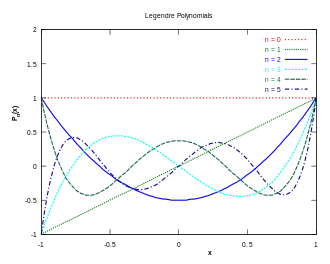 Les polynômes orthogonaux les plus simples sont les polynômes de Legendre pour lesquels l'intervalle d'orthogonalité est ]-1, 1[ et la fonction poids est la fonction constante de valeur 1 :
