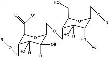 L'unité de base de l'héparane sulfate est un acide D-Glucuronique ou un acide L-Iduronique relié par une liaison α 1-4 à une glucosamine. La liaison entre les disaccharides est de type α 1-4 si la composition implique l'acide L-Iduronique, et β 1-4 pour l'acide D-Glucuronique.