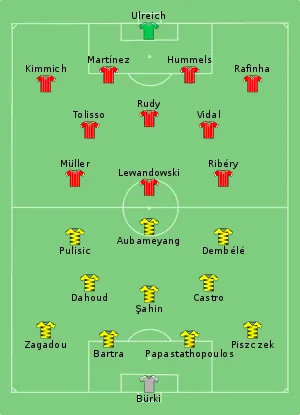 Christian Pulisic ouvre le score pour le Borussia Dortmund à la 12e minute lorsqu'il court vers le but et tire à ras de terre du pied droit devant Sven Ulreich. Robert Lewandowski porte le score à 1-1 à la 18e minute lorsqu'il tire du pied droit à bout portant après un centre à ras de terre de Joshua Kimmich. À la 71e minute, Pierre-Emerick Aubameyang redonne l'avantage au Borussia Dortmund en passant le ballon du pied droit au-dessus de Sven Ulreich.