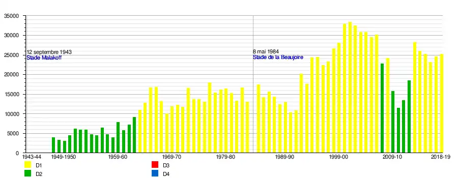De fait, la moyenne saisonnière de spectateurs en championnat ne dépasse les 10 000 par match qu'après l'accession en première division, pendant la saison 1963-1964, et ne dépasse les 15 000 qu'à sept reprises avant le déménagement à la Beaujoire en 1984, malgré une capacité de 30 000 places[4]. En comparant aux autres stades français, il faut cependant remarquer que le FCN est alors presque chaque année dans le trio de tête des fréquentations du championnat, derrière Marseille et alternativement derrière ou devant Saint-Étienne[5],[4].