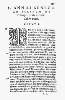 « Cette ferme assiette de l'âme, appelée chez les Grecs εὐθυμία, et qui fut pour Démocrite le texte d'un bel ouvrage, je l'appellerai tranquillité; car il n'est pas nécessaire d'imiter et de calquer jusqu'aux formes des expressions : la chose dont nous parlons veut être désignée par un terme qui ait la force du mot grec, non sa physionomie. Nous cherchons donc où réside cette constante égalité, cette allure uniforme d'une âme en paix avec elle-même, heureuse et charmée de ses seuls trésors, dont le contentement ininterrompu porte sur une base immuable, une âme enfin que rien ne peut enfler ni abattre : voilà la vraie tranquillité. »[2].