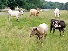 Vaches en liberté sur le pré communal de Selsley[1] (Gloucestershire, en Angleterre). Dans le passé, les prés communaux ont été localement à l'origine de la « tragédie des biens communs ».