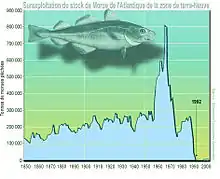 La surpêche est une des formes de la surexploitation des ressources, avec ici, pour exemple, l'effondrement des stocks de morue de l'Atlantique au large de la côte Est de Terre-Neuve en 1992 ;