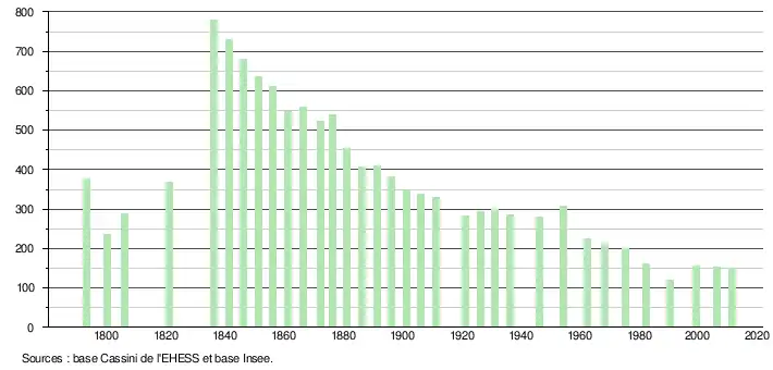 L'évolution du nombre d'habitants est connue à travers les recensements de la population effectués dans la commune depuis 1793. À partir du , les populations légales des communes sont publiées annuellement dans le cadre d'un recensement qui repose désormais sur une collecte d'information annuelle, concernant successivement tous les territoires communaux au cours d'une période de cinq ans. Pour les communes de moins de 10 000 habitants, une enquête de recensement portant sur toute la population est réalisée tous les cinq ans, les populations légales des années intermédiaires étant quant à elles estimées par interpolation ou extrapolation[13]. Pour la commune, le premier recensement exhaustif entrant dans le cadre du nouveau dispositif a été réalisé en 2006[14],[Note 2].