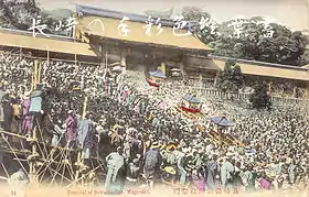 La structure temporaire est souvent attaquée par les chrétiens rebelles jusqu'en 1624 lorsque Aoki Kensei arrive à Nagasaki. Son zèle religieux et son habileté d'organisateur, combinés à l'autorité accordée par le premier conseil shintoïste Yoshida, conduisent à l'achèvement du bâtiment principal du Suwa-jinja[1]. Afin d'attirer l'attention et d'encourager la fréquentation du nouveau sanctuaire, un spectaculaire rituel yutate-sai (voir section Festivals infra). Malgré cela et en dépit d'une rencontre de sumo organisé ensuite, peu de personnes s'y rendent[1].