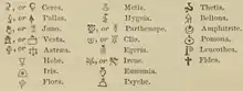 Des symboles sont créés au fur et à mesure des découvertes d'astéroïdes. Iris reçoit le symbole d'un arc-en-ciel et d'une étoile[47] : Flore, une fleur[47] ; Métis, un œil et une étoile[48] ; Hygie, un serpent dressé avec une étoile sur la tête[49] ; Parthénope, un poisson dressé et une étoile[49] ; Victoria, une étoile surmontée d'une branche de laurier[50] ; Égérie, un bouclier[51] ; Irène, une colombe portant une branche d'olivier, la tête surmontée d'une étoile[52] ; Eunomie, un cœur surmonté d'une étoile[53] ; Psyché, une aile de papillon munie d'une étoile[54] ; Thétis, un dauphin avec une étoile[55] ; Melpomène, une dague au-dessus d'une étoile[56] ; Fortune, une étoile surmontant une roue de la Fortune[56].
