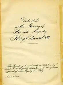 - Cette symphonie conçue début 1910 pour être un hommage royal porte cette dédidace : "Avec le gracieux assentiment de Sa Majesté le Roi, le 16 mars 1911".