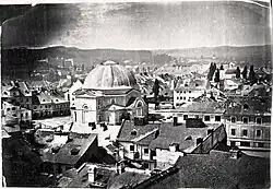 La construction est initialement prévue place Streletskaya (actuellement place Danylo Halytsky), mais en raison des protestations des religieuses du monastère bénédictin voisin, l'emplacement retenu se situe plus loin du centre, sur l'Alten Marktplatz (place du Vieux Marché). Le , la province autrichienne de Galicie vend le terrain à la communauté juive pour l'édification du bâtiment. La nouvelle synagogue désignée sous le nom de Tempel-Synagoge ou Deutsch-israelitisches Bethhaus (Maison de prière germano-israélite) est érigée de 1843 à 1846 (ou selon l'inscription sur la plaque commémorative actuelle de 1844 à 1845) selon les plans de l'architecte Ivan Levitsky (ou Lewicki), sous la supervision de l'architecte officiel de la direction des travaux publics Johann Salzmann[3]. Son comité de construction, qui incluait de riches maskillim décide que la synagogue sera construite en s'inspirant de la grande-synagogue de Vienne, dite Stadttempel, située au 4 Seitenstattgasse[4].