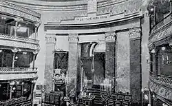 « L'intérieur de a synagogue s'inspire largement de la Stadttempel de Vienne. La salle de prière est ronde, encerclée par deux niveaux de dix-huit colonnes doriques supportant les galeries, qui sont élégamment inclinées vers l'extérieur, laissant la partie est du cercle libre pour l'Arche Sainte. La salle est surmontée d'un dôme et éclairée par une lanterne zénithale. L'Arche Sainte est installée dans une abside avec la Bimah par devant, et fait face aux fidèles. Les Tables de la Loi, dans une auréole rayonnante, sont situées au-dessus de l'Arche. La rangée de bancs occupe le centre de la salle; les fidèles font constamment face à l'Arche orientée vers l'Est pendant les offices.
