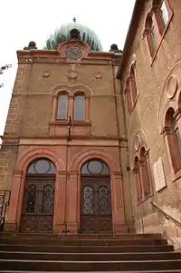 La synagogue d'Ingwiller[1] (Bas-Rhin) qui date de 1822 pour sa partie la plus ancienne et qui a été agrandie en 1891 est construite sur les soubassements d'un château des comtes de Lichtenberg qu'on devine sur la vue générale à droite[2]. Elle n'accueille plus de services religieux réguliers. Le bulbe de cuivre de style oriental date de 1913.