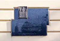 « Sur ce site se trouvait la synagogue qui a été incendiée par des nazis locaux le premier jour de l'occupation, le . De la communauté religieuse juive, 2 292 membres périrent victimes du génocide nazi »