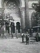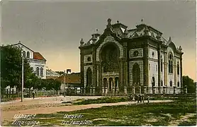 Les architectes sont Gyula Papp et Ferenc Szabolcs, ils imaginent un bâtiment éclatant de style néo-byzantin avec des éléments néo-mauresques. Il s'agit du premier bâtiment en béton de la ville. Au cours de la Seconde Guerre mondiale, le bâtiment est très endommagé, les troupes allemandes et hongroises utilisent le bâtiment comme écuries. En 1947, l'édifice est transformé en salle de concert car apprécié pour ses qualités acoustiques. Les autorités soviétiques décident de cette reconversion malgré l'opposition des juifs rescapés de la Shoah de retour dans la ville. L'orchestre symphonique régional y est localisé.