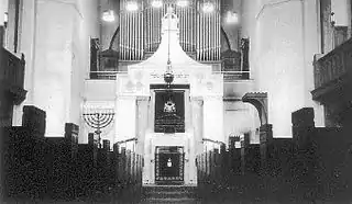 À l'est, plusieurs marches conduisent à une estrade avec la table de lecture (Bimah), le chandelier à huit branches et le siège du rabbin. Dans le fond, s'élève, montrant toute sa splendeur architecturale, le Saint des Saints (Arche Sainte) pour la conservation des rouleaux de Torah. Un rideau brodé (Parokhet) cache une solide porte fermée à clef protégeant les rouleaux. La chaire permet l'accès au sanctuaire qui peuvent tous les deux être vus de tous les sièges de la synagogue. Derrière le sanctuaire se trouve à l'étage de la galerie, la tribune pour l'orgue et le chœur. Au-dessus de cette salle, s'élève une coupole avec un lanterneau, qui trouve toute son expression architectonique par la haute construction en forme de tour s'affichant sur la façade.
