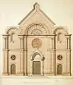 Un majestueux bâtiment de 130 pieds de long sur 72 pieds de large, entièrement en pierre et de style byzantin, situé dans la partie inférieure de la Königstraße et parfaitement visible de tous les côtés, qui sera reconnu par les étrangers et les habitants comme un ornement, non seulement de ce quartier, mais de notre belle ville. Le pignon ouest de la façade principale avec trois entrées à arc plein-cintre, une entrée principale et deux entrées latérales pour les galeries des femmes- une grande baie-fenêtre au-dessus de l'entrée principale; de gracieuses lésènes en pierre de grès bruns taillées, situées sur les côtés, à intervalles de 20 pieds, avec des corniches doubles et des ornements intermédiaires agréables, de même aux quatre coins du bâtiment, des pilastres délimitent les tours rectangulaires; Sur la façade, au-dessus de la baie-fenêtre, s'élève le fronton à angle obtus, au sommet duquel la signification sacrée du bâtiment est proclamée d'une simplicité ingénieuse, en lettres dorées, par les Tables de la Loi. Tout cela donne une impression de la plus grande bienveillance. Les façades latérales de la maison de culte ne paraissent pas moins dignes. Entre les tours d'angle, le toit d'ardoises scintille en pente modérée. Entre les lésènes, les fenêtres à arc plein-cintre complètent le caractère de l'ensemble de la plus belle expression de simplicité et de noblesse…