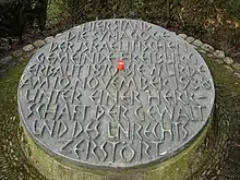 « Ici se trouvait la synagogue de la communauté israélite de Fribourg, construite en 1870. Elle a été détruite le par un régime de violence et d'injustice »