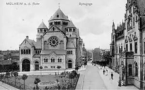 La synagogue de Mülheim, inaugurée en 1907, a été détruite en 1938 lors de la nuit de Cristal comme la plupart des autres lieux de culte juif en Allemagne.