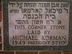 - Traduction de l'hébreu: Cette pierre angulaire a été posée par Michael Korman, président de la synagogue le 30 Tishrei 5710