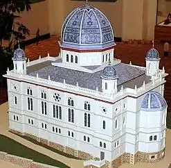 « La nouvelle synagogue, l'un des bâtiments les plus beaux de notre ville, offre une vue admirable, par son architecture spacieuse et finement structurée. Au sommet s'élève la coupole principale couronnée par l'Étoile de David, et flanquée de quatre petites coupoles d'angle… comme une imposante et sécurisante forteresse de la foi. Notre synagogue située sur une des hauteurs de la ville, peut être vue à des kilomètres à la ronde. La décoration intérieure est en rapport avec la beauté des formes extérieures. Par le hall d'accueil spacieux, où se trouvent des deux côtés les escaliers menant aux galeries, on pénètre dans la salle principale à trois nefs, qui offre une vue d'ensemble vers l'est, sur l'autel surélevé et l'Arche Sainte… L'installation de la synagogue a été fournie gracieusement en grande partie par les membres de la communauté et ces dons précieux ont formé la base des objets sacrés et des parures sacrées… »