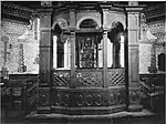Le plafond voûté était supporté par quatre colonnes en bois qui entouraient la bimah et par des fermes dans le toit[3]. On accédait à la Bimah richement sculptée, légèrement surélevée par un petit escalier en bois. L'Arche sainte, située sur le mur est, en bois sculpté peint, s'élevait sur trois niveaux avec une abondance de motifs, des colonnades, des menorahs, des vases, des guirlandes de fleurs en bas-reliefs, des tours, les Tables de la Loi, et un aigle[3].