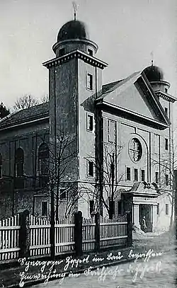 La synagogue ressemble à une église catholique. C'est un bâtiment moderniste en brique construit selon un plan rectangulaire de 21,12 mètres par 15,66 mètres. Du côté ouest, se dresse la façade avec deux tours rectangulaires couronnées d'un dôme. Dans sa partie centrale se trouve un portail surmonté d'une rosace décorative et du tympan. Par le portail, on pénètre dans un vaste vestibule donnant sur la salle de prière. Celle-ci, au rez-de-chaussée est cernée sur trois côtés au niveau du premier étage par une galerie réservées aux femmes. Les ajouts latéraux comprennent une salle de prière et un vestiaire, une salle pour les Brit Milah (circoncision) et la chaufferie. La synagogue est entourée d'un jardin dans lequel chaque automne est montée une soukka pour les fêtes de Souccot.