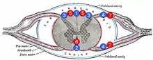 Section transversale d'une moelle épinière. Une atteinte en regard des numéros 3 et/ou 5 donnerait un syndrome cordonal postérieur.
