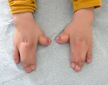 - Il existe des anomalies avec une fusion des doigts des mains et des pieds, ou syndactylie. Cette syndactylie comprend 4 doigts sur 5 réalisant l’aspect dit « en cuiller », « en main d’accoucheur » ou « en moufles ».