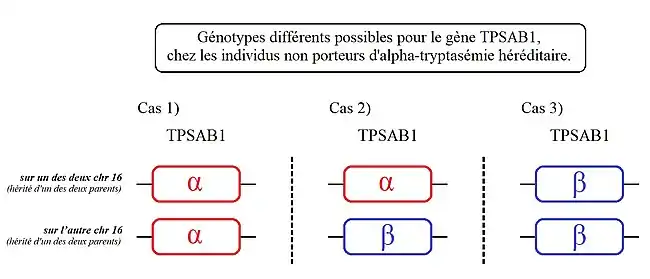 Cas 1) : les personnes présentant ce génotype ont une copie de TPSAB1 codant l'alpha-tryptase sur chacun de leurs chromosomes 16.