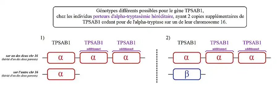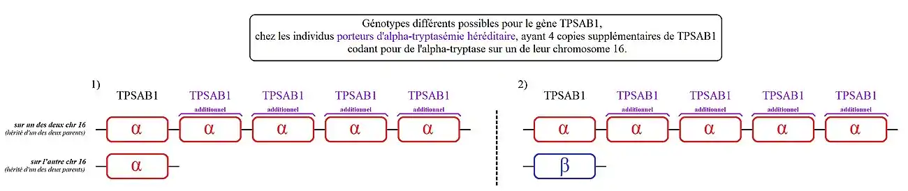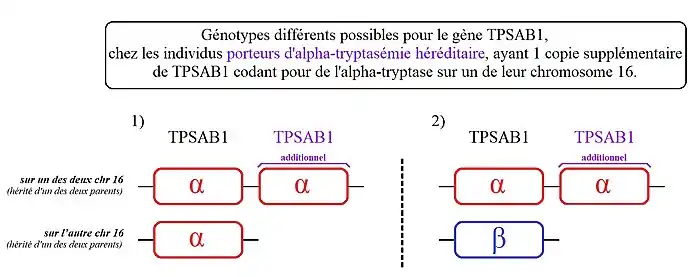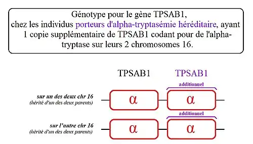 2) Les personnes présentant ce génotype, ont une copie de TPSAB1 codant la bêta-tryptase sur l'un des deux chromosomes 16 et 3 copies de TPSAB1 codant l'alpha-tryptase sur leur autre chromosome 16.
