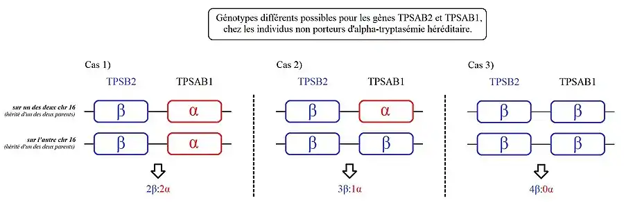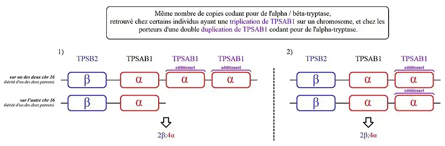 Cas 2) : les personnes présentant ce génotype, ont une copie de TPSAB1 codant l'alpha-tryptase sur l'un des deux chromosomes 16 et une autre codant de la bêta-tryptase sur leur autre chromosome 16.