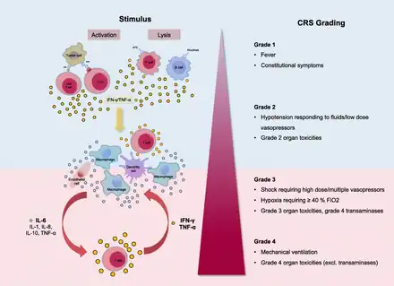 Cette suractivation du système immunitaire peut être secondaire à une infection ou à un effet indésirable de certains médicaments à anticorps monoclonal, ainsi que des thérapies associées aux lymphocytes T[3],[4].Ce syndrome apparaissant à l'administration d'un médicament est nommé réaction à la perfusion[5].
