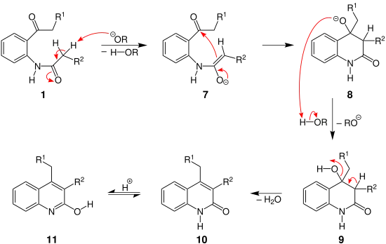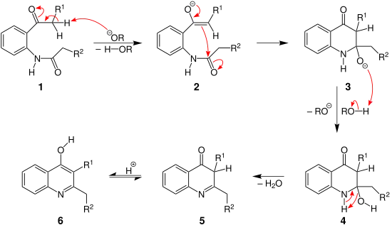 Tout d'abord, la base déprotonise le groupe méthylène de la N-acyl-ortho-acylaniline (1), formant ainsi un énolate (2). Le groupe carbonyle se reforme, et la double liaison C=C qui vient d'être formée va attaquer de manière nucléophile l'atome de carbone de l'autre groupe carbonyle, formant ainsi un hétérocycle à six (3). Le groupe alcoolate de cet intermédiaire va alors réagir avec la base protonnée pour former un alcool (4). Ce même groupe va finalement arracher le proton du groupe amine voisin et partir, formant une imine cyclique (5). Cette dernière va enfin se réorganiser par un équilibre de tautomérisation céto-énolique pour former la 2,3-dialkyl-4-hydroxyquinoléine (6).