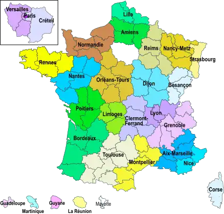 L'année scolaire française compte 36 semaines de classe, entrecoupées de périodes de vacances scolaires. Ces dernières ont lieu pendant l'automne, durant la période des fêtes de fin d'année civile, vers février et mars et vers avril et mai[37]. Les vacances d'été, entre juillet et août, sont souvent appelées « grandes vacances ». Pour la France métropolitaine, un système de zones (A, B et C) regroupant chacune certaines académies permet des décalages de dates de vacances pour les vacances d'hiver et de printemps[37].