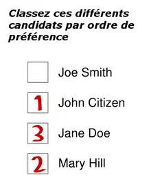 Ce mode de scrutin sert à l'élection des députés australiens depuis 1919. Il permet à des partis alliés de se présenter séparément devant les électeurs, mais sans affaiblir leurs chances de coalition, comme c'est le cas en Australie avec les deux partis de droite (Parti libéral et Parti national). En outre les électeurs des petits candidats ne perdent pas leurs votes, puisqu'ils concourent eux aussi à la désignation des principaux candidats grâce à leurs préférences suivantes. Comme pour le scrutin uninominal à un tour, le découpage électoral peut engendrer des risques de contradiction entre la victoire en voix et celle en sièges[22]. Le vote alternatif déforme le vote populaire de la même manière que le scrutin uninominal à un tour : aux élections fédérales australiennes de 2007, les Verts, avec 7,5 % des suffrages exprimés, n'ont obtenu aucun siège, contrairement au Parti national qui en a eu plusieurs avec un score moins important, profitant de son alliance avec le Parti libéral. Il existe d'autres méthodes par classement assez semblables, quoique plus complexes dans le décompte des voix, qui ont été peu ou pas utilisées, comme le vote par approbation (dit aussi vote par assentiment), la méthode Condorcet ou encore la méthode de Coombs.
