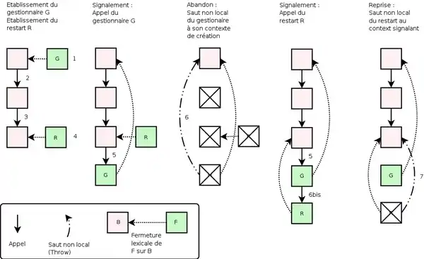 Bien sûr, si le gestionnaire décide d'abandonner le calcul (#6 bis), un saut non-local est effectué vers le cadre où G a établi ses liaisons lexicales (et en particulier l'étiquette utilisée pour le saut) ; la pile d'appels est détruite, R est détruit, et juste après le saut, G lui-même est détruit.