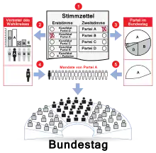 - Avec la première voix (en allemand : Erststimme ou Wahlkreisstimme), il vote en faveur d'un candidat dans sa circonscription.