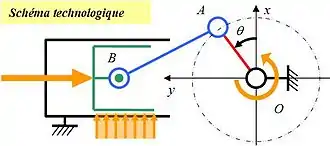 On considère ici que le système bielle-manivelle est dans la configuration où la liaison de l'extrémité de la bielle est une liaison glissière (cas des moteurs et pompes) ; que le mécanisme est un mécanisme plan et que l'axe du piston croise l'axe de la manivelle (axes concourant). La géométrie, suivant le schéma ci-contre, est décrite par :