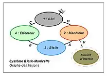 Le système bielle-manivelle permet la transformation du mouvement linéaire de l'extrémité de la bielle en un mouvement de rotation continu disponible sur la manivelle (vilebrequin), et réciproquement. Il est constitué de 4 pièces principales :