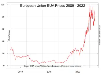 En février 2022, le prix de la tonne de CO2 sur le marché européen frôle les 100 €[28]. En décembre 2022, il est proche de 80 €. Afin de faire monter ces prix pour inciter les entreprises à investir dans des technologies moins polluantes, l’Union européenne a décidé de retirer du marché les quotas excédentaires : une réserve de stabilité du marché (MSR pour Market Stability Reserve), lancée en janvier 2019, a permis de retirer 354 millions de quotas sur près d’1,7 milliard en 2020. Entre septembre 2021 et août 2022, près de 380 millions de quotas sont placés dans cette réserve. La réforme du marché du carbone en préparation va porter l’objectif de réduction des émissions de gaz à effet de serre des secteurs du SEQE à 62 % d’ici 2030 par rapport aux niveaux de 2005, et un deuxième marché du carbone, spécifique au chauffage des bâtiments et au transport routier, pourrait être créé ; un mécanisme d’ajustement carbone aux frontières sera instauré ; les quotas gratuits devraient être supprimés très progressivement à partir de 2026, jusqu’à totalement disparaître en 2034[29].