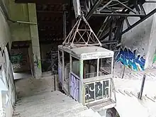 ![]() Vue en 2011 de la gare de départ rénovée aux Pélerins : l'ouverture empruntée par les cabines est désormais fermée par la verrière. |