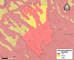La commune est vulnérable au risque de mouvements de terrains constitué principalement du retrait-gonflement des sols argileux[23]. Cet aléa est susceptible d'engendrer des dommages importants aux bâtiments en cas d’alternance de périodes de sécheresse et de pluie. La totalité de la commune est en aléa moyen ou fort (76,3 % au niveau départemental et 48,5 % au niveau national). Sur les 401 bâtiments dénombrés sur la commune en 2019, 401 sont en aléa moyen ou fort, soit 100 %, à comparer aux 90 % au niveau départemental et 54 % au niveau national. Une cartographie de l'exposition du territoire national au retrait gonflement des sols argileux est disponible sur le site du BRGM[24],[Carte 3].