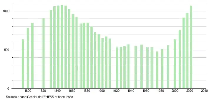 | L'évolution du nombre d'habitants est connue à travers les recensements de la population effectués dans la commune depuis 1793. Pour les communes de moins de 10 000 habitants, une enquête de recensement portant sur toute la population est réalisée tous les cinq ans, les populations légales des années intermédiaires étant quant à elles estimées par interpolation ou extrapolation[28]. Pour la commune, le premier recensement exhaustif entrant dans le cadre du nouveau dispositif a été réalisé en 2006[29]. En 2021, la commune comptait 1 067 habitants[Note 5], en augmentation de 9,77 % par rapport à 2015 (Tarn : +1,82 %, France hors Mayotte : +1,84 %). |