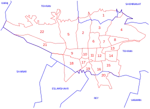 La municipalité de Téhéran (shahrdāri) est divisée en 22 arrondissements (mantagheh) municipaux, disposant chacun de son centre administratif. Les arrondissements sont numérotés pour être identifiés, comme sur le plan ci-contre. Téhéran est divisée en 112 quartiers (nāhiyeh) dont les principaux sont rappelés ci-après[13] :