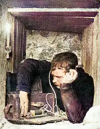 - Dans un deuxième temps : dans les secteurs de couleur des montres radio-marine, les stations radiotélégraphiques doivent cesser les radiotélégrammes, puis effectuer un silence radio obligatoire de trois minutes quatre fois par heure (jusqu'en 1932 puis deux fois par heure jusqu'en 1999), pour effectuer l’écoute obligatoire sur la fréquence de 500 kHz[15], afin de repérer un éventuel signal de détresse arrivant même très faible, non perçu durant le reste du temps utilisé pour les appels divers avec un dégagement sur une autre fréquence : appel général de routine (CQ), appel individuel de routine, appel d'urgence (XXX) et appel de sécurité (TTT)[16]. Exemple de radiotélégraphie de routine sur 500 kHz. Cette disposition ne s'applique pas aux stations en détresse.