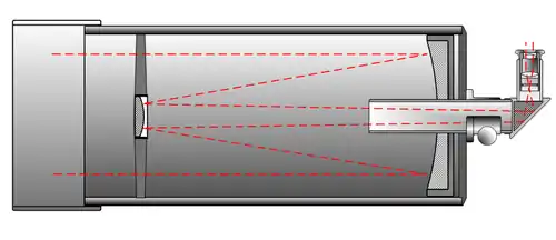 Contrairement au télescope de Newton, le miroir primaire est percé en son centre et les axes optiques des deux miroirs coïncident. L'image formée peut donc être perçue par un observateur, un capteur CCD, etc., placé derrière le télescope et non sur le côté comme dans le télescope de Newton, ce qui a pour effet de ne pas faire tourner l'image comme dans ce dernier.