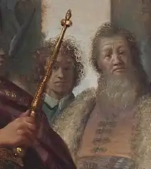 Rembrandt se représente dans la composition, en donnant son visage au personnage situé derrière le grand personnage au sceptre[9]. Rembrandt cherche ici à satisfaire l'amateur : en faisant connaître son visage au travers de nombreux autoportraits, l'amateur peut se prévaloir de reconnaître le peintre quand celui-ci inclut un autoportrait caché dans ses tableaux d'histoire (l'autoportrait dit in assistenza) : c'est aussi le cas dans les commandes La Lapidation de saint Étienne (1625, Musée des Beaux-Arts de Lyon) et L'Érection de la croix (1633, Alte Pinakothek). C'était une pratique courante, qui consistait aussi pour l'artiste à rester dans l'histoire (memoriae)[9].