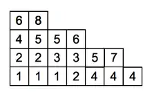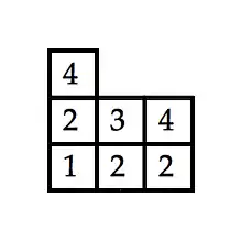 Au lieu de prendre les valeurs d'un tableau de Young dans les entiers, on les prend dans un alphabet quelconque, totalement ordonné[3]. Lorsque l'on lit successivement les lignes d'un tableau de Young semi-standard, on obtient une suite de mots croissants au sens large sur cet alphabet. Chaque mot de cette suite domine le suivant dans le sens que et de plus pour . Pour le diagramme de Young de la partition (3,3,1), les mots des lignes sont , et chacune domine la suivante. Le produit des mots de lignes est parfois lui-même appelé tableau[4]. Dans notre exemple, c'est le mot . La correspondance entre mots et tableau semi-standard est bijective : pour décoder le mot, il suffit à chaque fois de prendre le préfixe le plus long qui est croissant au sens large. Dans le tableau ci-contre de forme , le mot-tableau se factorise en lignes dont chacune domine la suivante.