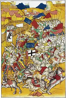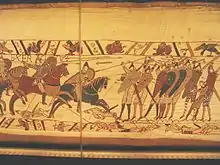 La principale différence entre les guerres précédentes et celles du Moyen Âge a été l'utilisation de la cavalerie lourde, fournie par les chevaliers. Les chevaliers venaient régulièrement à bout de la « piétaille » armée d'épées, de haches et de pieux - voire d'outils agricoles ou de bâtons - car, bien que fréquemment plus nombreuse que ceux-ci, dans un rapport allant parfois de cinq à dix contre un, elle était généralement reléguée à un rôle de soutien et de protection des bagages[note 4]. L'infanterie armée de piques pouvait contrer la menace posée par la cavalerie ennemie ; fossés, barricades ou pieux étaient également utilisés comme protection contre la charge de cavalerie, tandis que les archers abattaient les cavaliers ennemis par leurs volées de flèches, comme lors de la Bataille d'Azincourt en 1415.